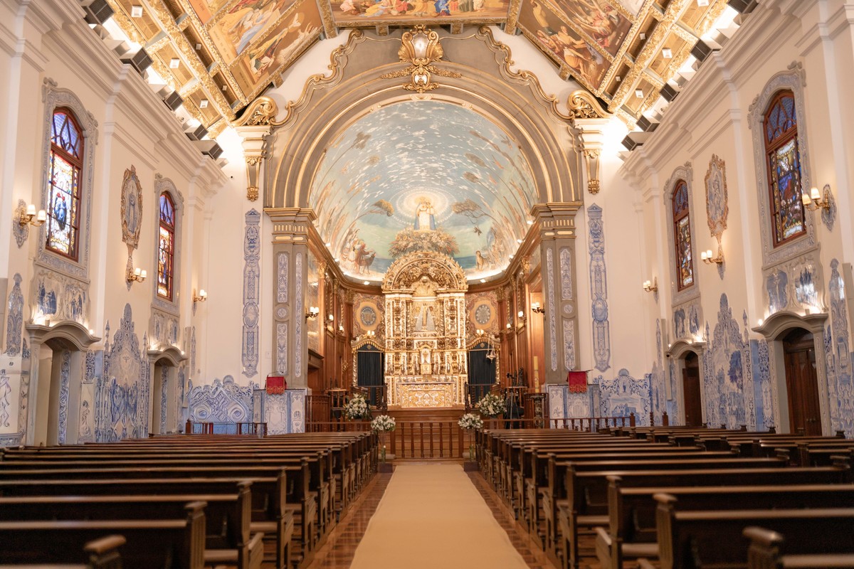 Só família perto, votos sinceros e a luz suave entrando pelos vitrais.