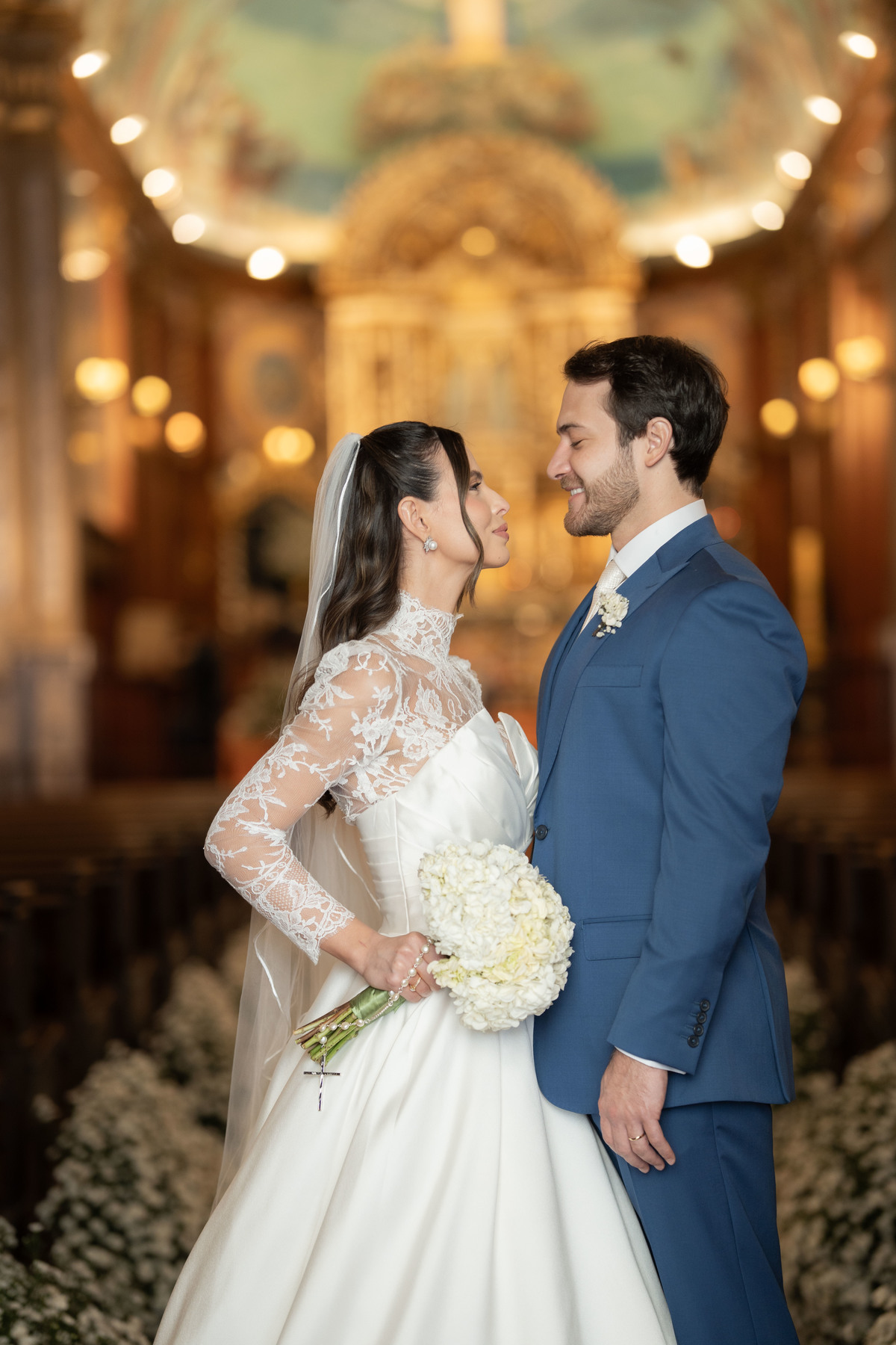 A luz suave da manhã entrando pela igreja, a maquiagem impecável do @cauefmarques realçando ainda mais a beleza dela, e o vestido @casamarelanoivas Noivas, leve e clássico, acompanhando cada passo com naturalidade.